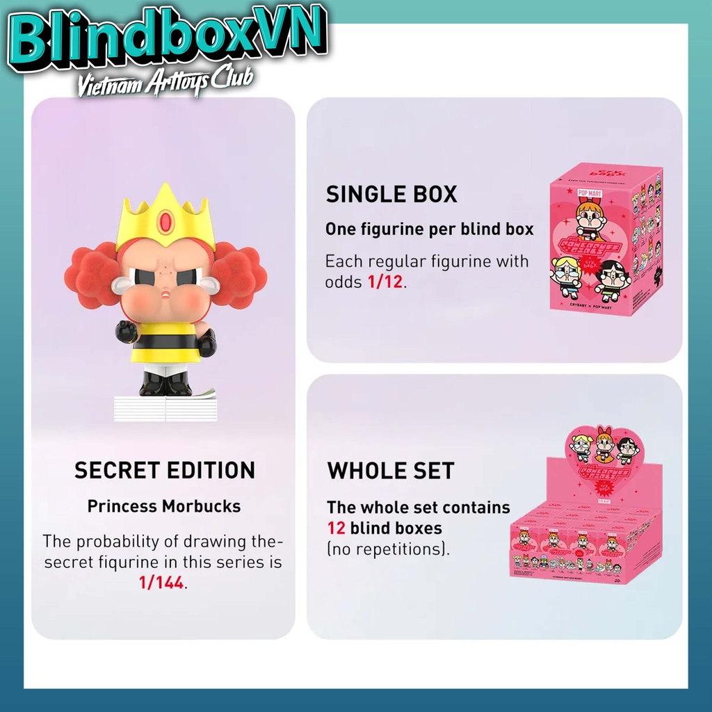 1. Hộp đơn : Đối với box lẻ vì đây là blindbox ( hộp mù ) ngẫu nhiên người mua sẽ không xác định được bên trong là gì nhưng khi mua nhiều sản phẩm trên cùng 1 đơn hàng thì sẽ không bị trùng mẫu , có tỷ lệ mở ra SECRET