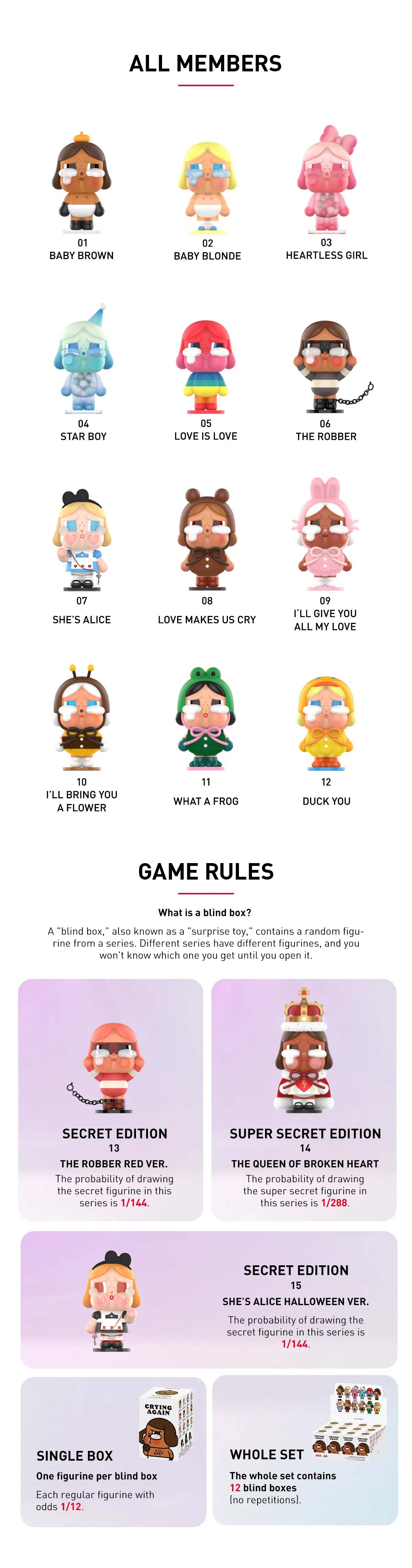 1. Hộp đơn : Đối với box lẻ vì đây là blindbox ( hộp mù ) ngẫu nhiên người mua sẽ không xác định được bên trong là gì nhưng khi mua nhiều sản phẩm trên cùng 1 đơn hàng thì sẽ không bị trùng mẫu , có tỷ lệ mở ra SECRET